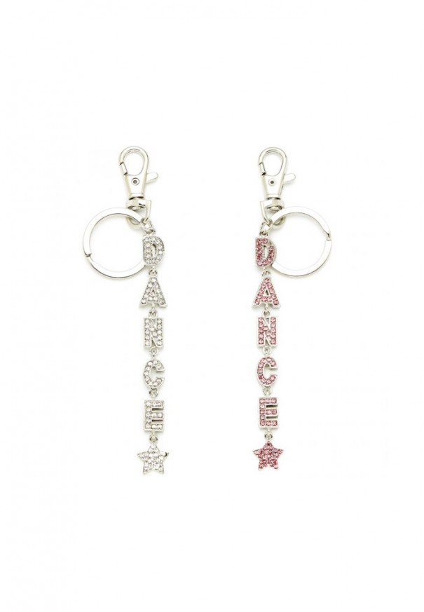 Llavero de plata hecho con piedras brillantes deletrea la palabra "DANCE".