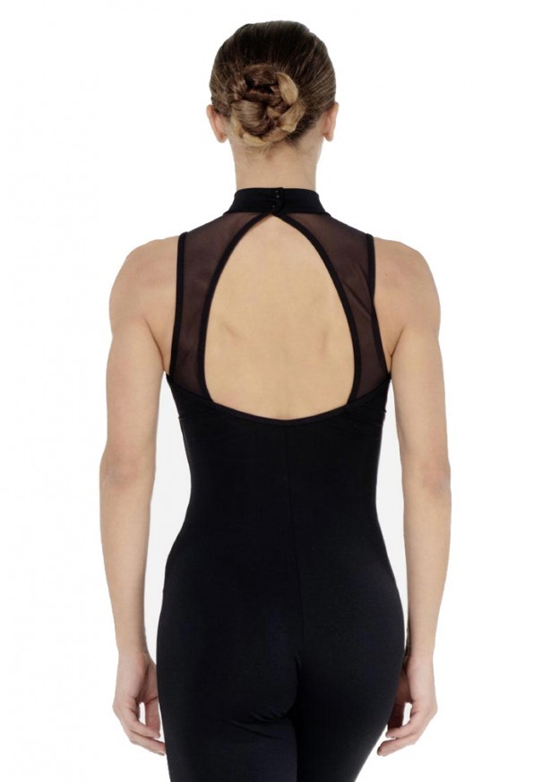 Unitard de cuello alto "Rachael" para mujer. Este mono de cuello alto cuenta con un elegante canesú de malla en la parte delantera y una espalda abierta con tirantes anchos de malla. Otras características incluyen cierres a presión en el cuello para ponérselos y quitárselos con facilidad, y un forro de sostén con repisa.