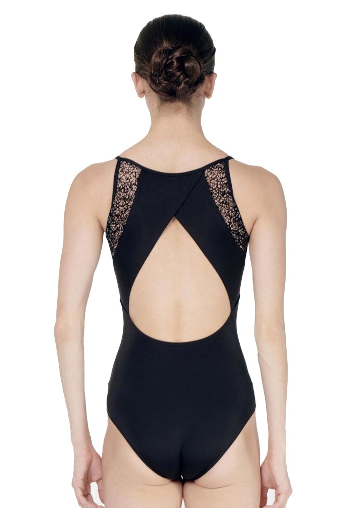 Maillot camisola "Dayana" para mujer. Este maillot de camisola presenta un escote delantero ajustado, inserciones de malla flocada en blanco y negro y un diseño cruzado en la espalda.